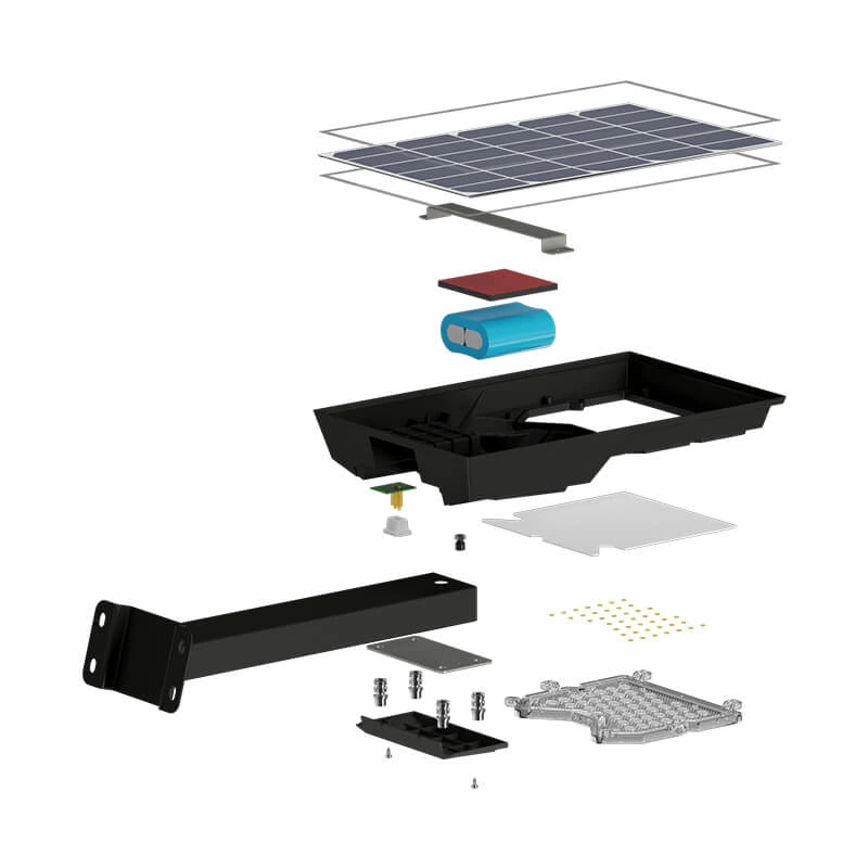集成太阳能路灯,灯具内置磷酸铁锂电池、太阳能电池板和充电器。